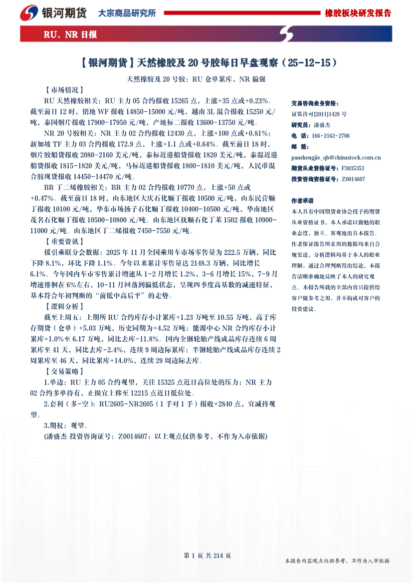 银河期货-天然橡胶及20号胶每日早盘观察-251215