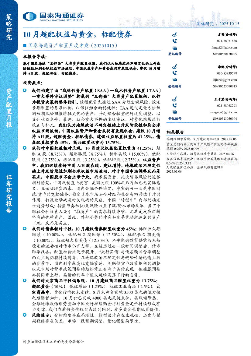国泰海通证券-资产配置月度方案:10月超配权益与黄金,标配债券-251015