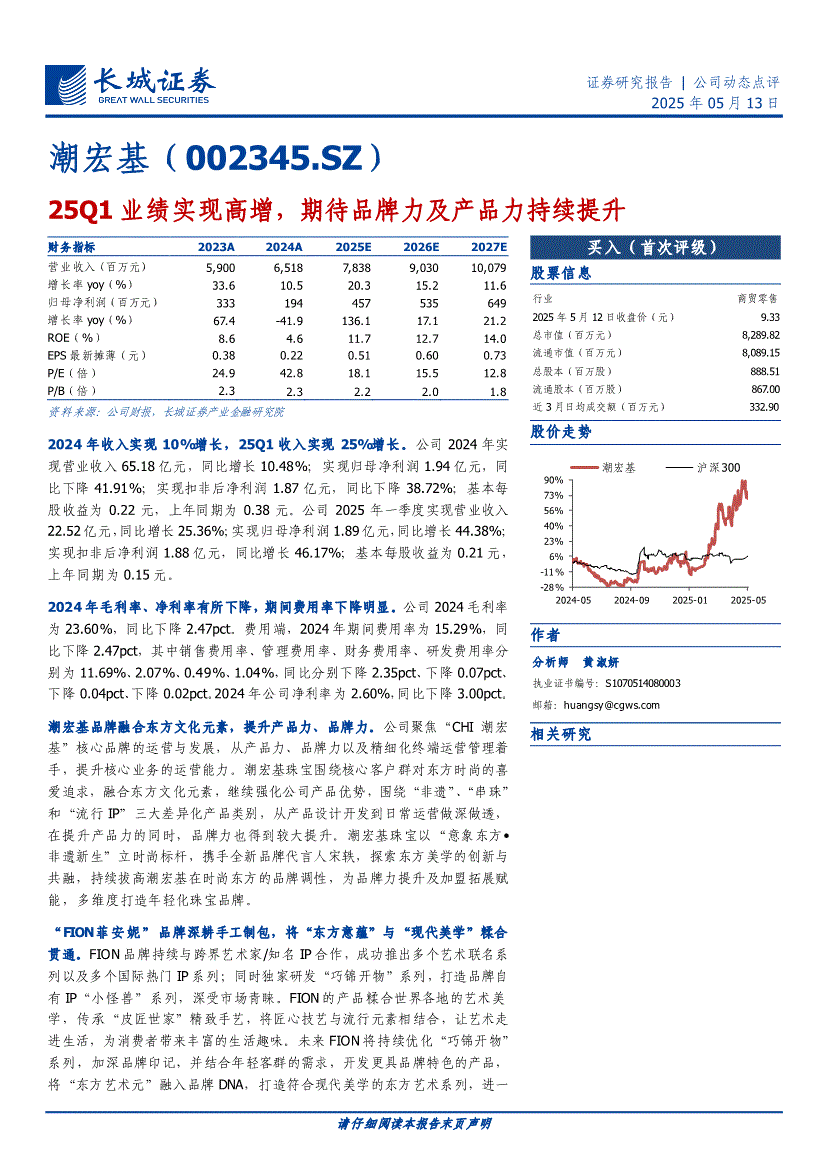 潮宏基:长城证券-潮宏基-002345-25Q1业绩实现高增,期待品牌力及产品力持续提升-250513