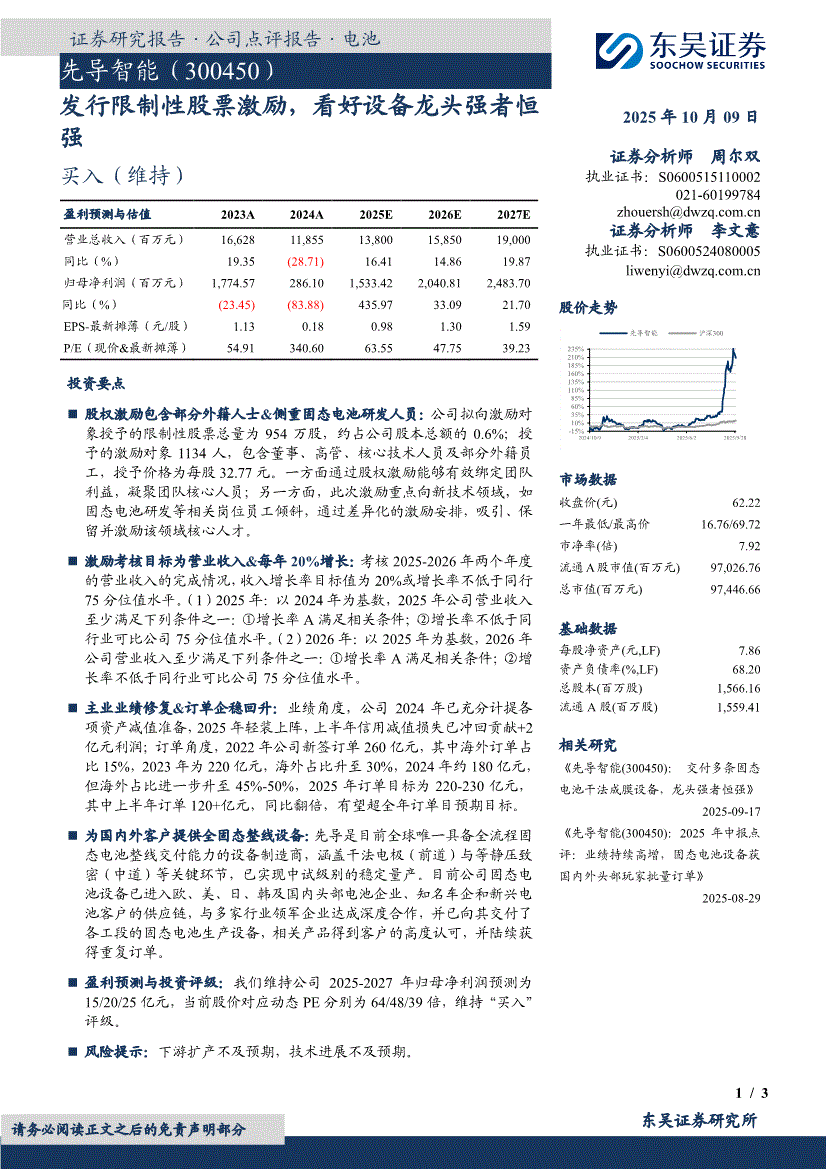 先导智能:东吴证券-先导智能-300450-发行限制性股票激励,看好设备龙头强者恒强-251009