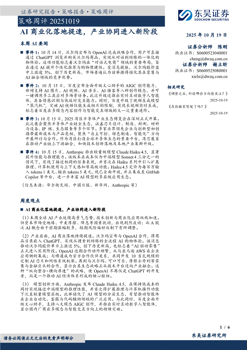东吴证券-策略周评:AI商业化落地提速,产业协同进入新阶段-251019