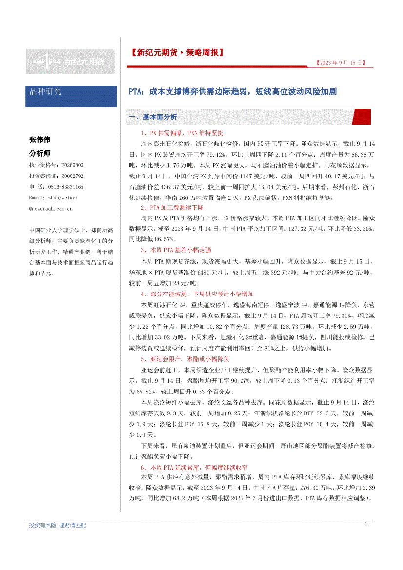 新纪元期货-PTA策略周报:成本支撑博弈供需边际趋弱,短线高位波动风险加剧-230915