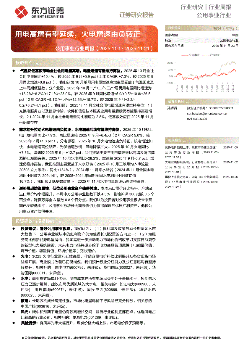 公用事业行业:东方证券-公用事业行业周报:用电高增有望延续,火电增速由负转正-251123
