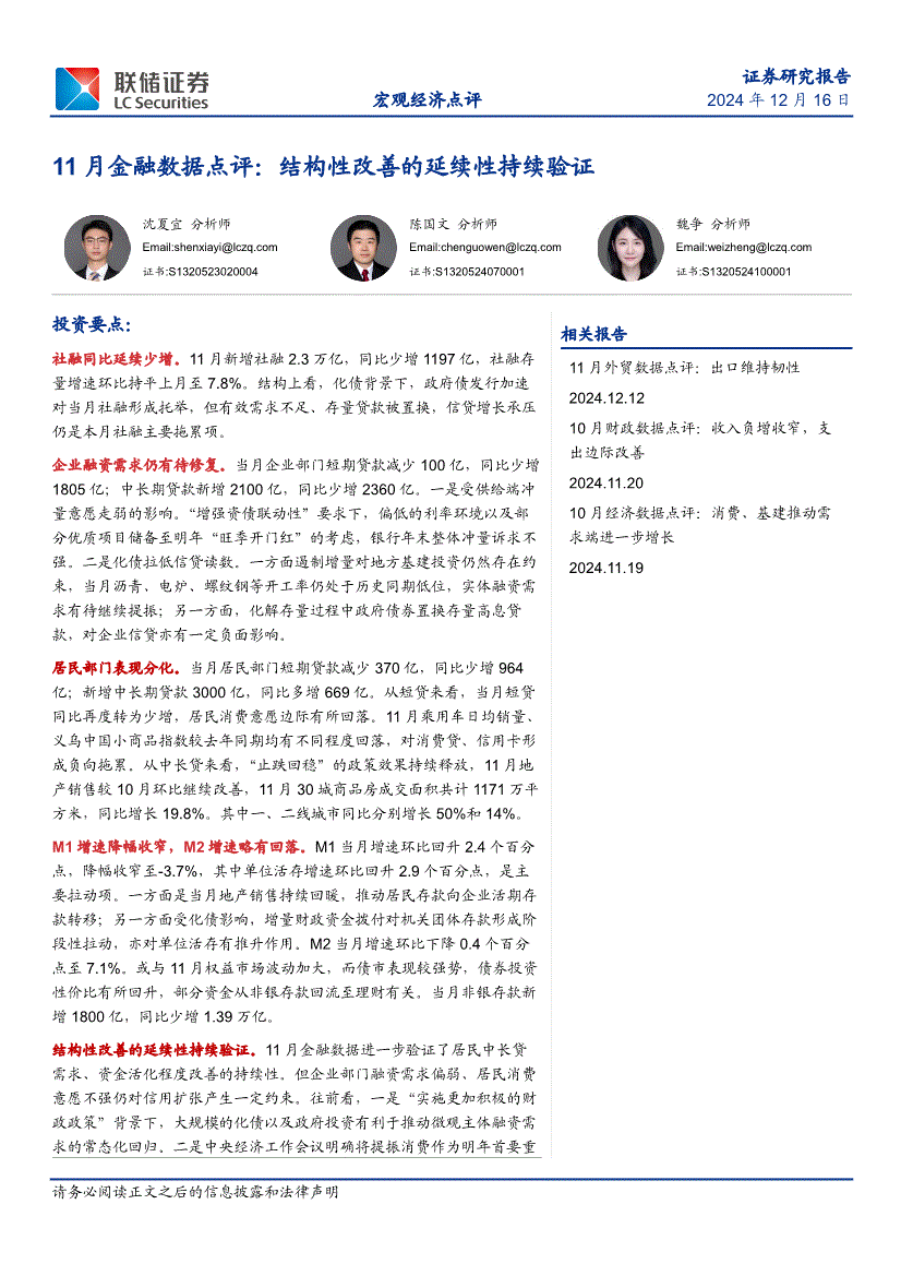 联储证券-11月金融数据点评:结构性改善的延续性持续验证-241216