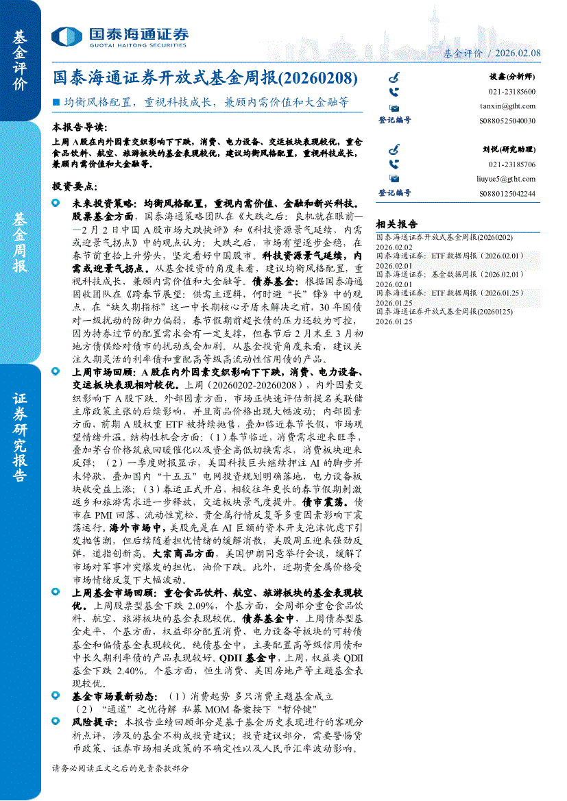 国泰海通证券-开放式基金周报:均衡风格配置,重视科技成长,兼顾内需价值和大金融等-260208