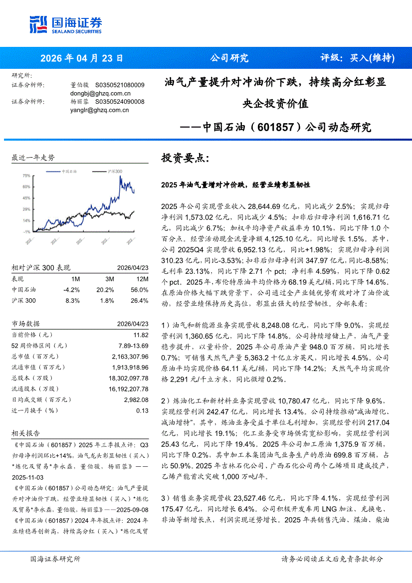 中国石油:国海证券-中国石油-601857-公司动态研究:油气产量提升对冲油价下跌,持续高分红彰显央企投资价值-260423