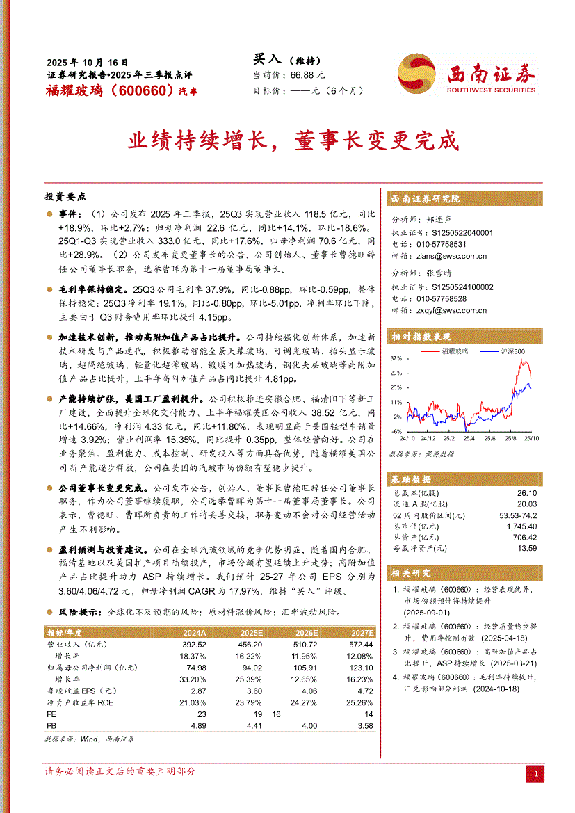 福耀玻璃:西南证券-福耀玻璃-600660-业绩持续增长,董事长变更完成-251016
