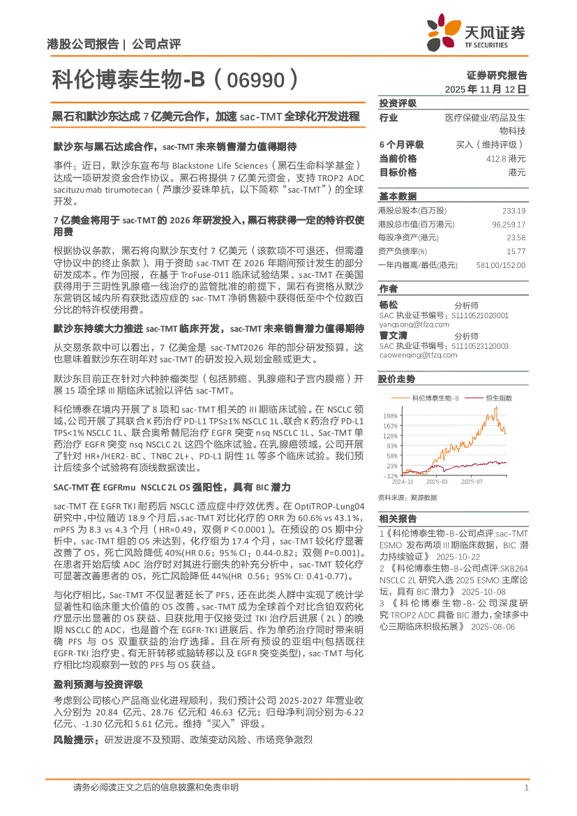 科伦博泰生物~B:天风证券-科伦博泰生物~B-6990.HK-黑石和默沙东达成7亿美元合作,加速sac~TMT全球化开发进程-251112