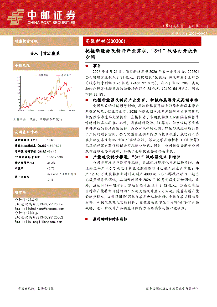 高盟新材:中邮证券-高盟新材-300200-把握新能源及新兴产业需求,“3+1”战略打开成长空间-260427