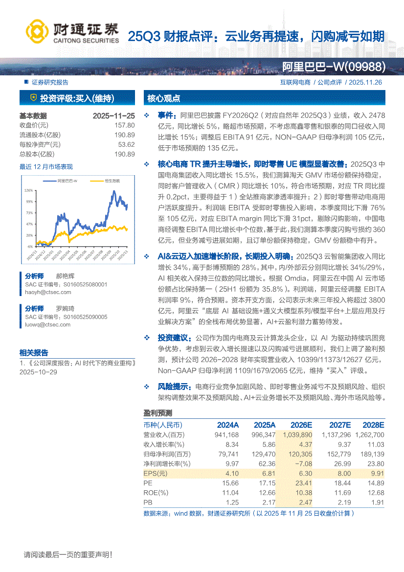 阿里巴巴~W:财通证券-阿里巴巴~W-9988.HK-25Q3财报点评:云业务再提速,闪购减亏如期-251126