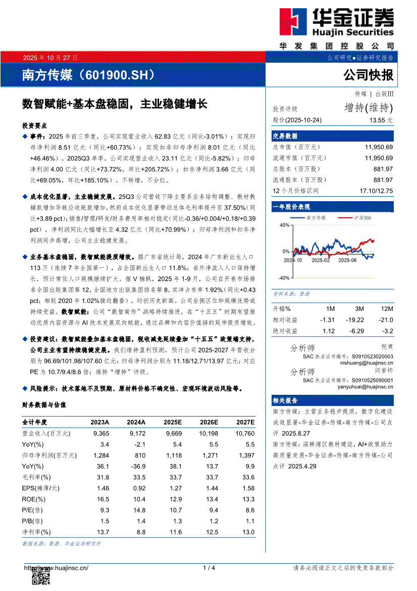 南方传媒:华金证券-南方传媒-601900-数智赋能+基本盘稳固,主业稳健增长-251027