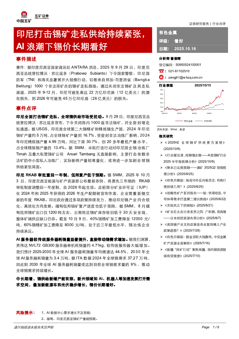 有色金属行业:五矿证券-有色金属行业点评:印尼打击锡矿走私供给持续紧张,AI浪潮下锡价长期看好-251016