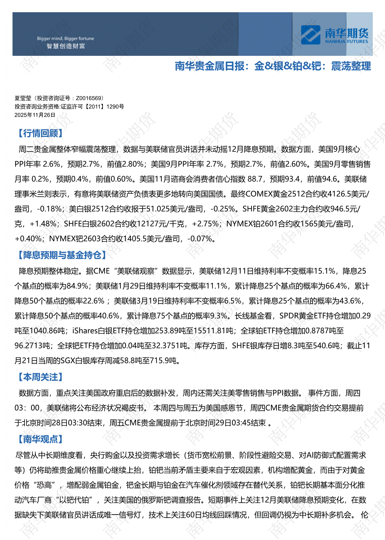 南华期货-贵金属日报:金&银&铂&钯,震荡整理-251126