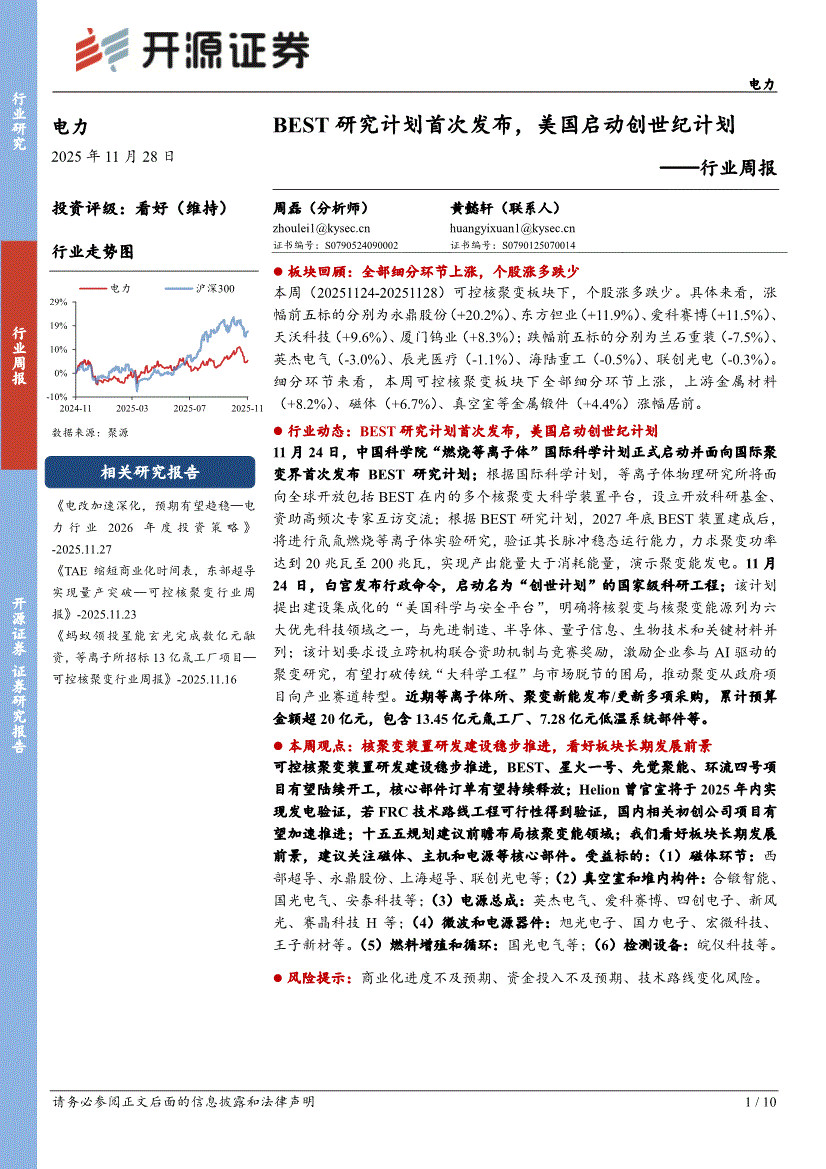 电力行业:开源证券-电力行业周报:BEST研究计划首次发布,美国启动创世纪计划-251128