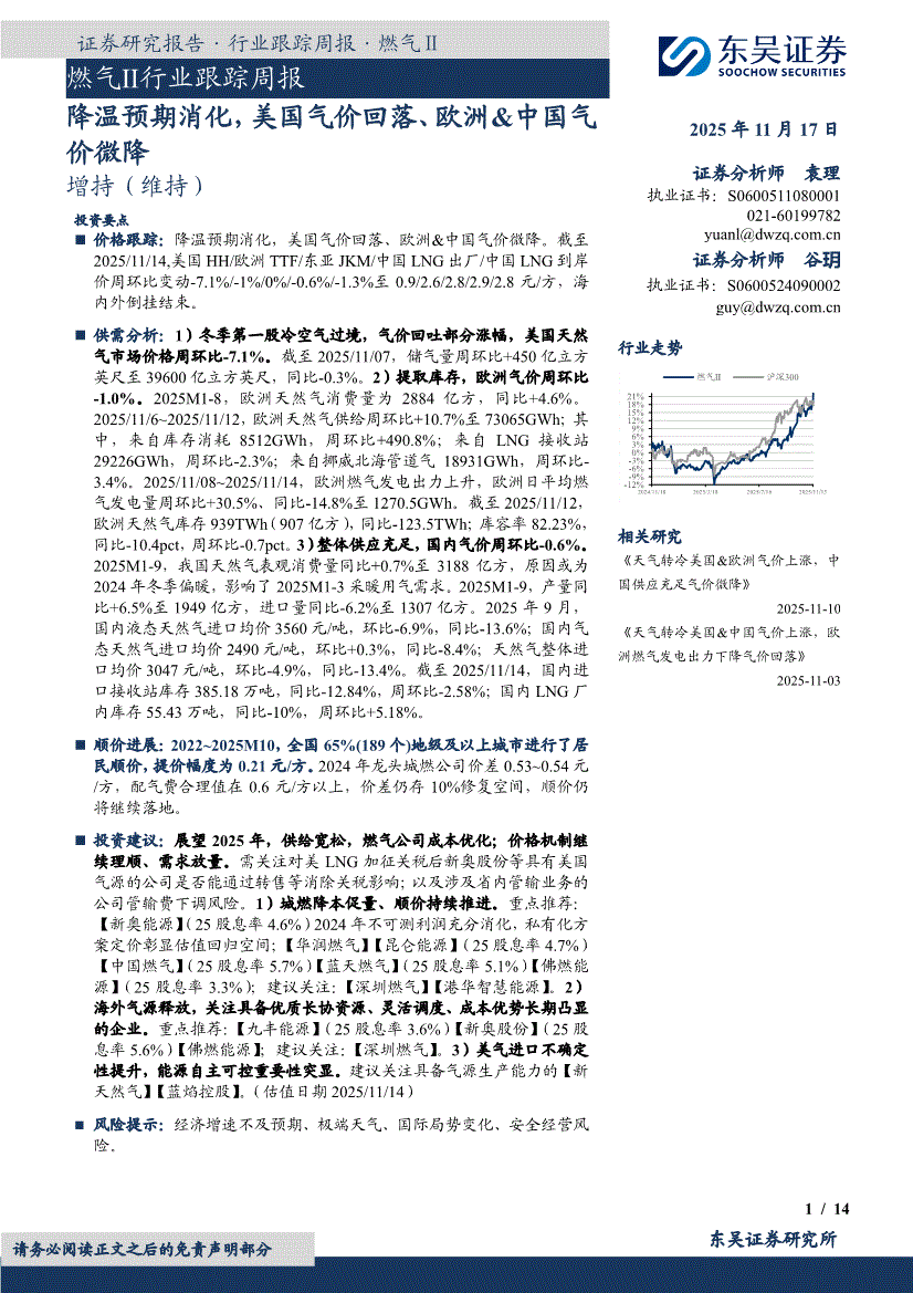 燃气行业:东吴证券-燃气Ⅱ行业跟踪周报:降温预期消化,美国气价回落、欧洲&中国气价微降-251117