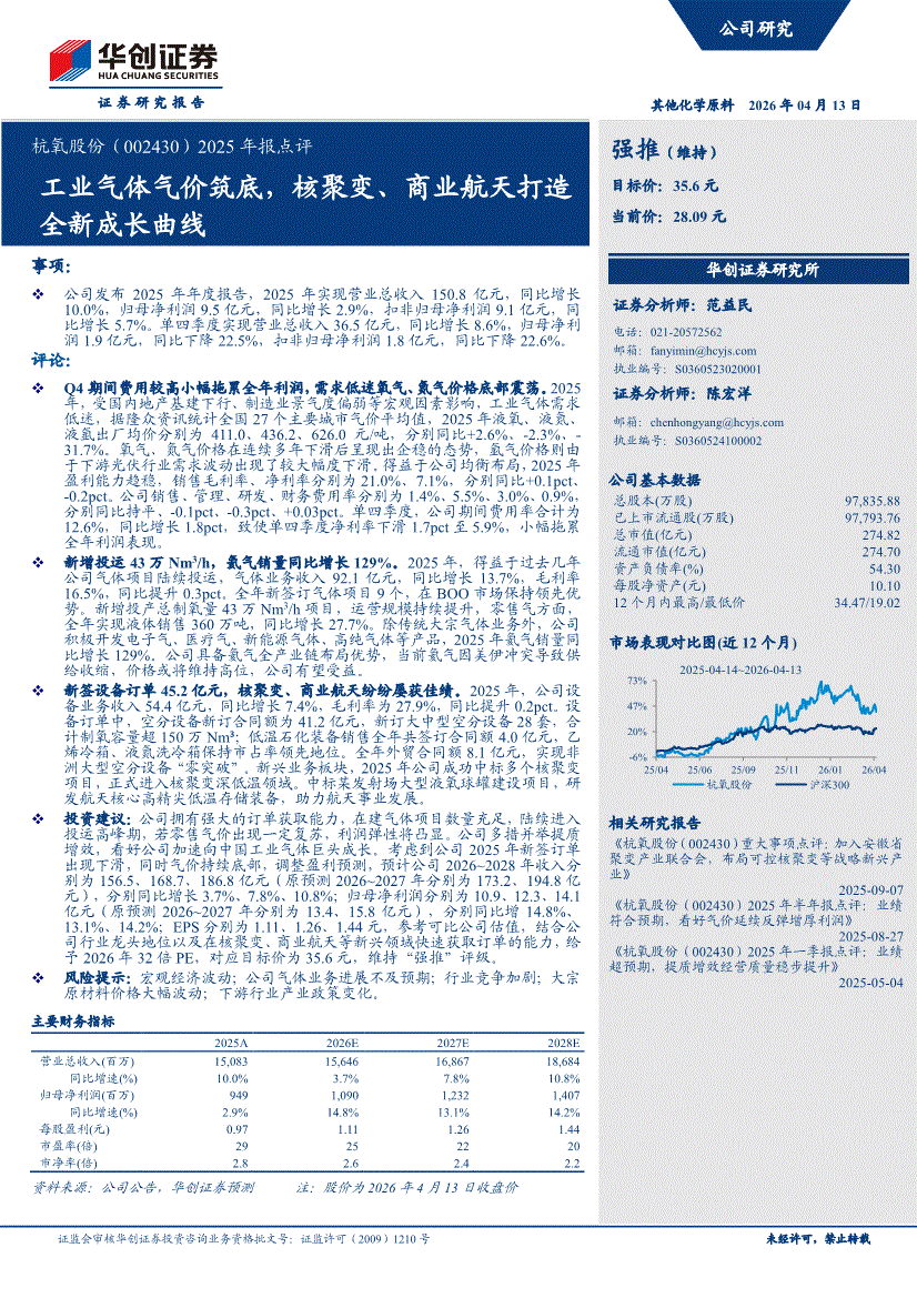 杭氧股份:华创证券-杭氧股份-002430-2025年报点评:工业气体气价筑底,核聚变、商业航天打造全新成长曲线-260413