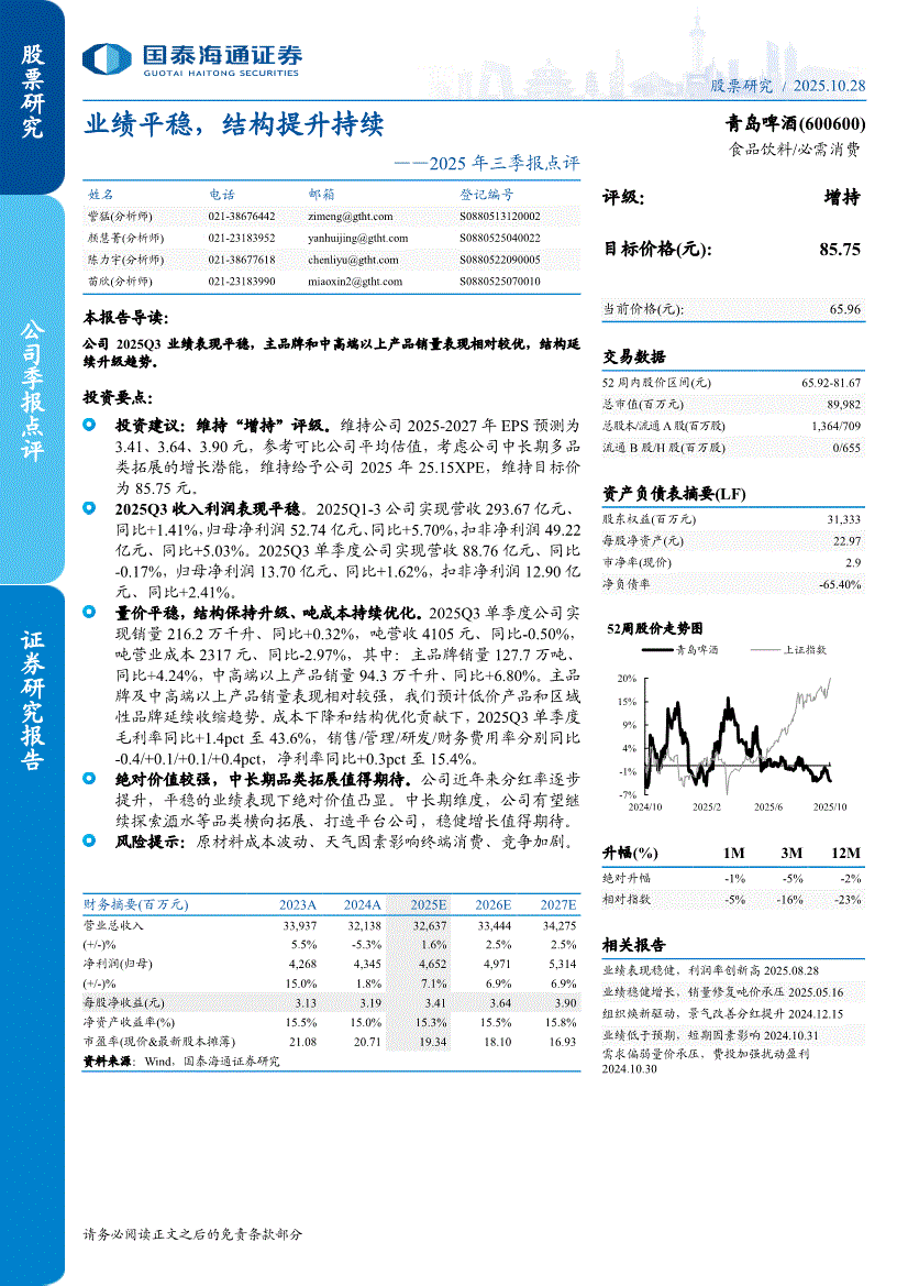 青岛啤酒:国泰海通证券-青岛啤酒-600600-2025年三季报点评:业绩平稳,结构提升持续-251028