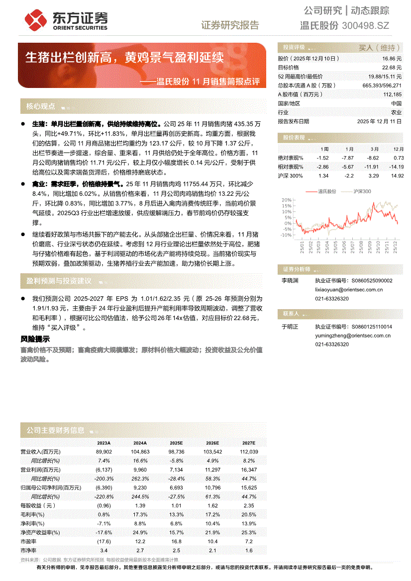 温氏股份:东方证券-温氏股份-300498-11月销售简报点评:生猪出栏创新高,黄鸡景气盈利延续-251211