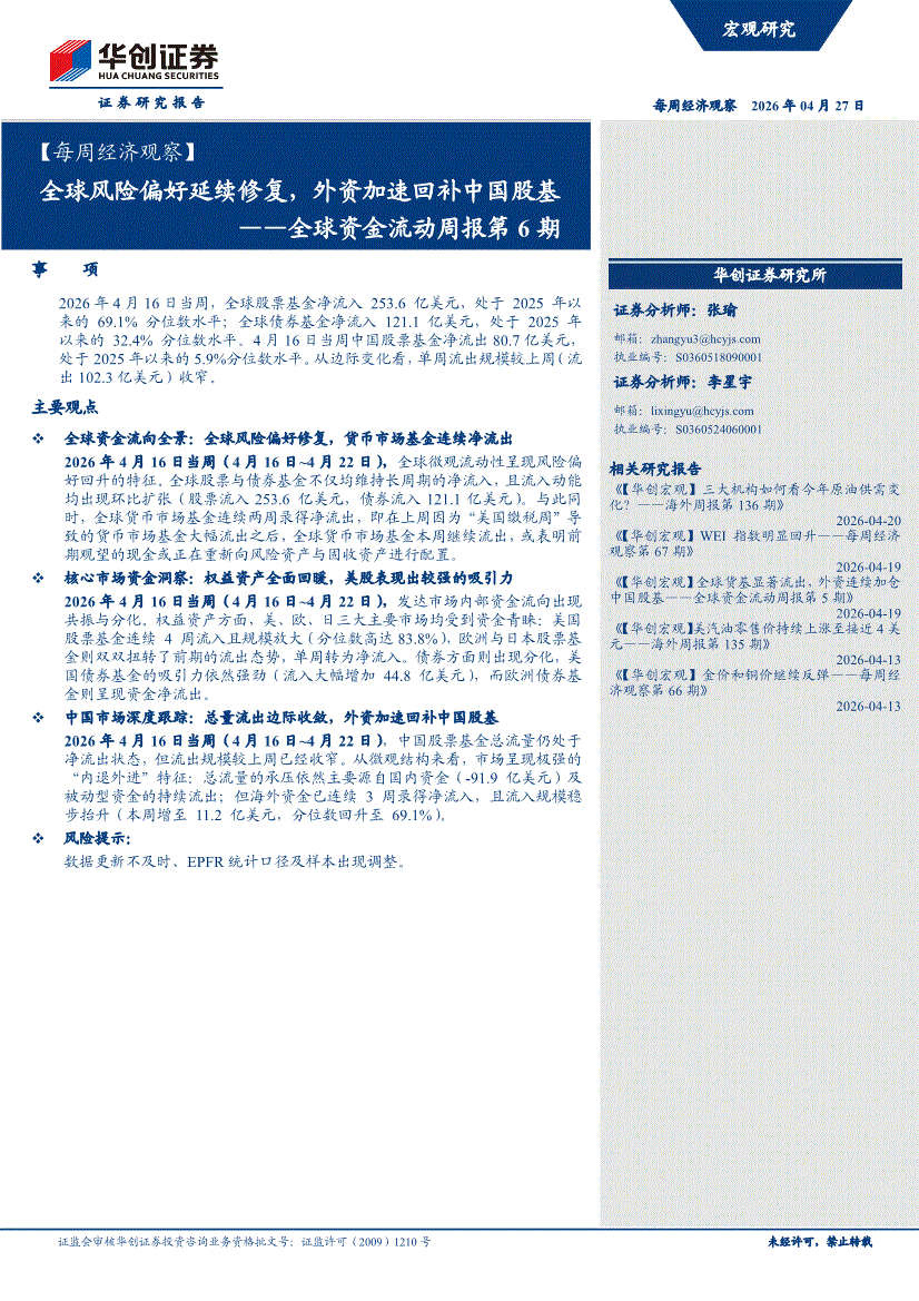 华创证券-【每周经济观察】全球资金流动周报第6期:全球风险偏好延续修复,外资加速回补中国股基-260427