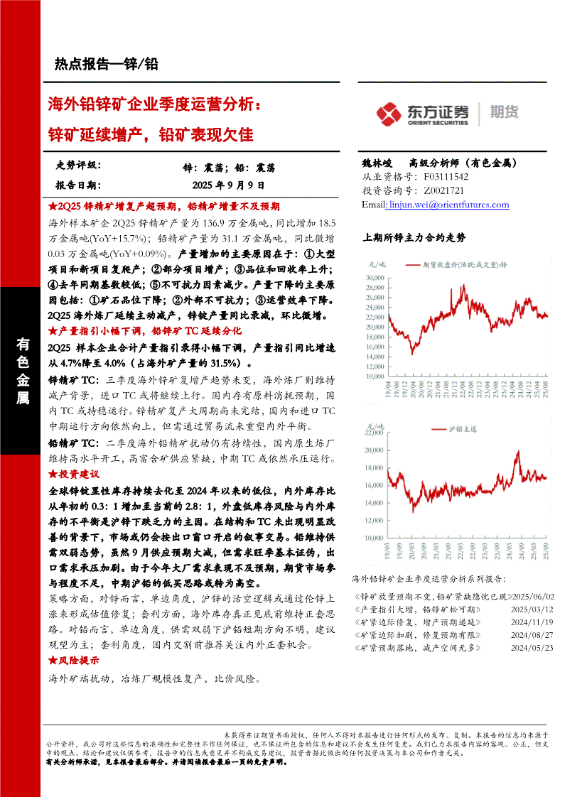 东证期货-海外铅锌矿企业季度运营分析:锌矿延续增产,铅矿表现欠佳-250909