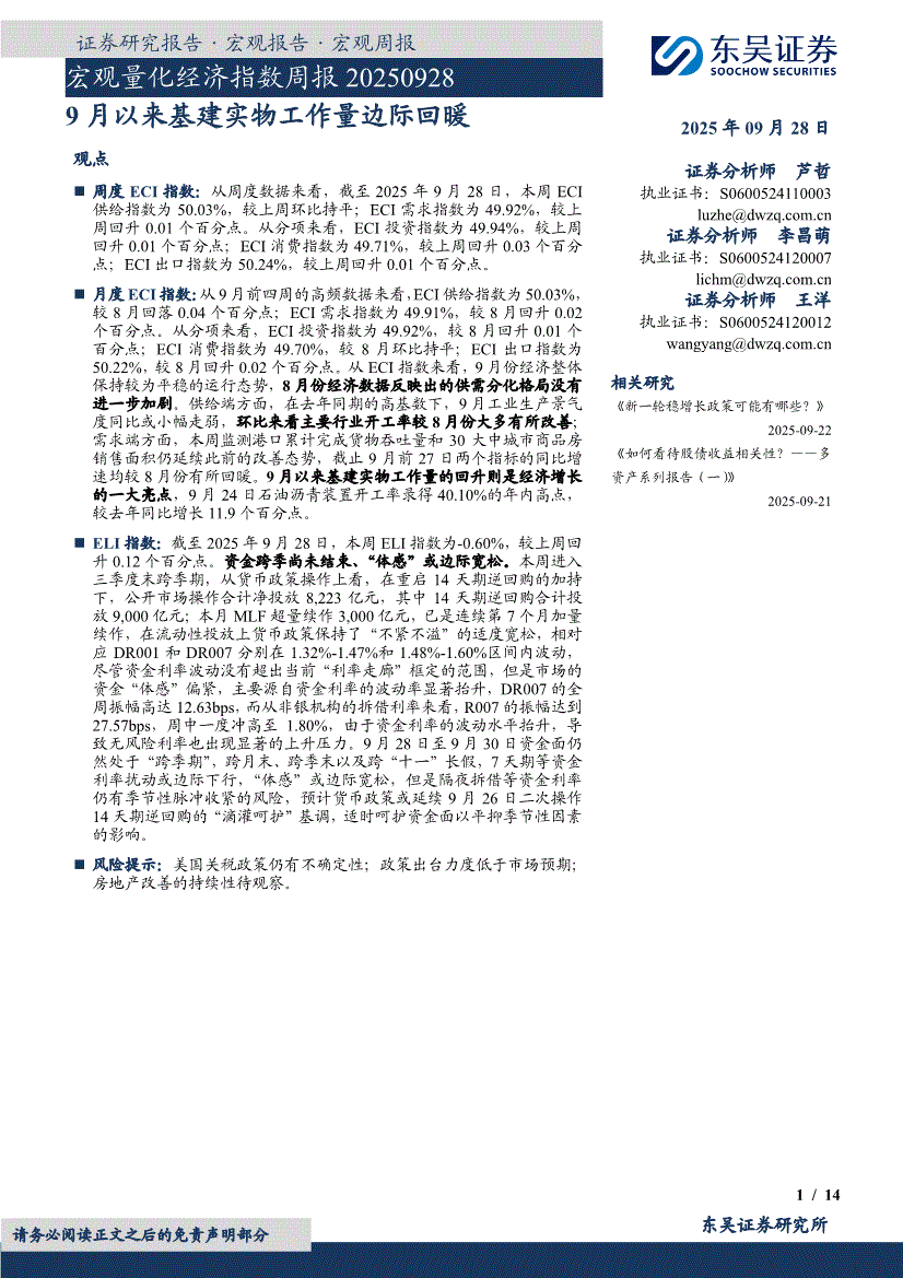 东吴证券-宏观量化经济指数周报:9月以来基建实物工作量边际回暖-250928