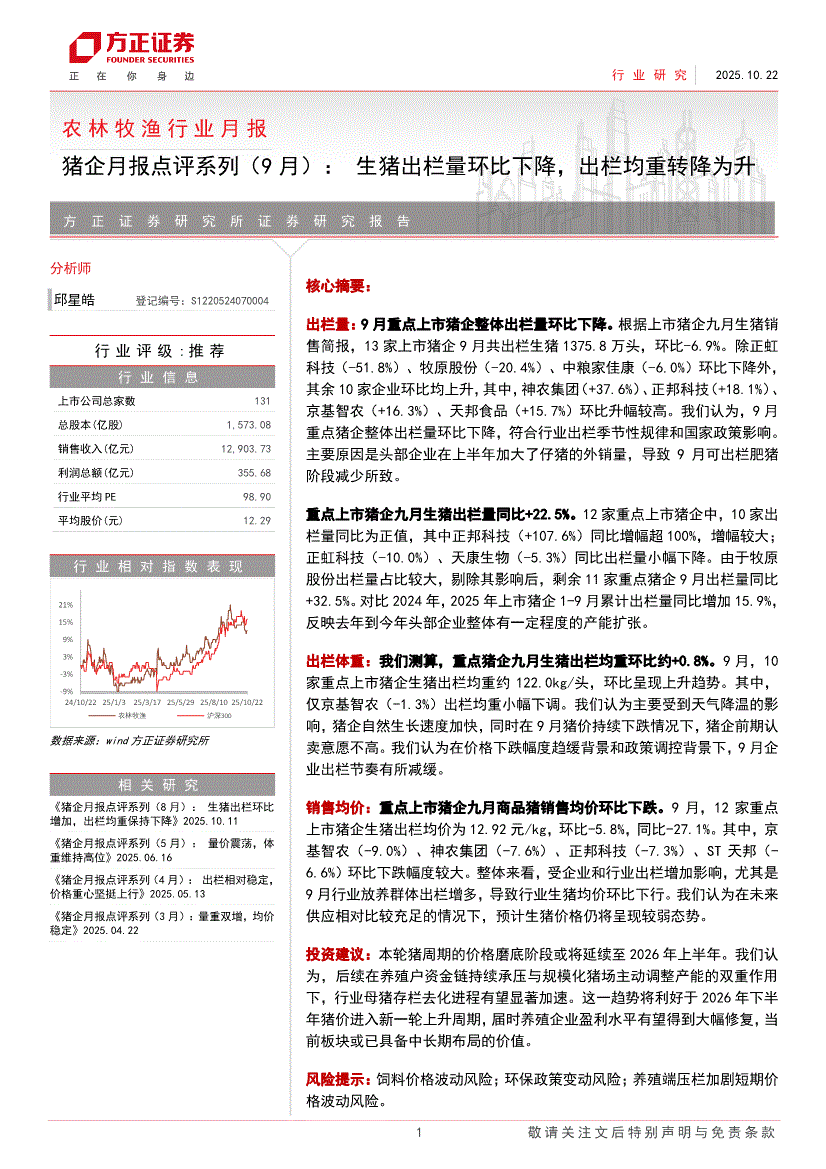农林牧渔行业:方正证券-农林牧渔行业月报:猪企月报点评系列(9月),生猪出栏量环比下降,出栏均重转降为升-251022