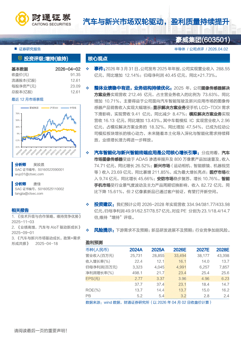 豪威集团:财通证券-豪威集团-603501-汽车与新兴市场双轮驱动,盈利质量持续提升-260402