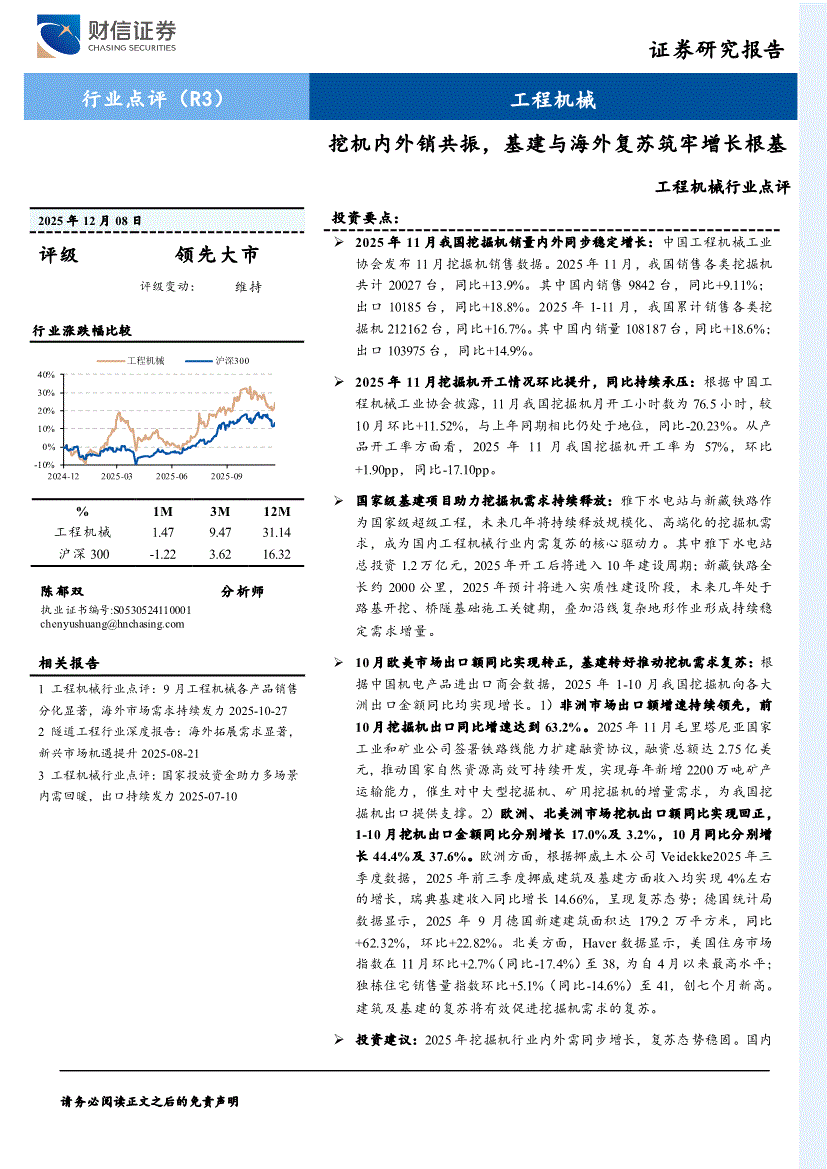 工程机械行业:财信证券-工程机械行业点评:挖机内外销共振,基建与海外复苏筑牢增长根基-251208