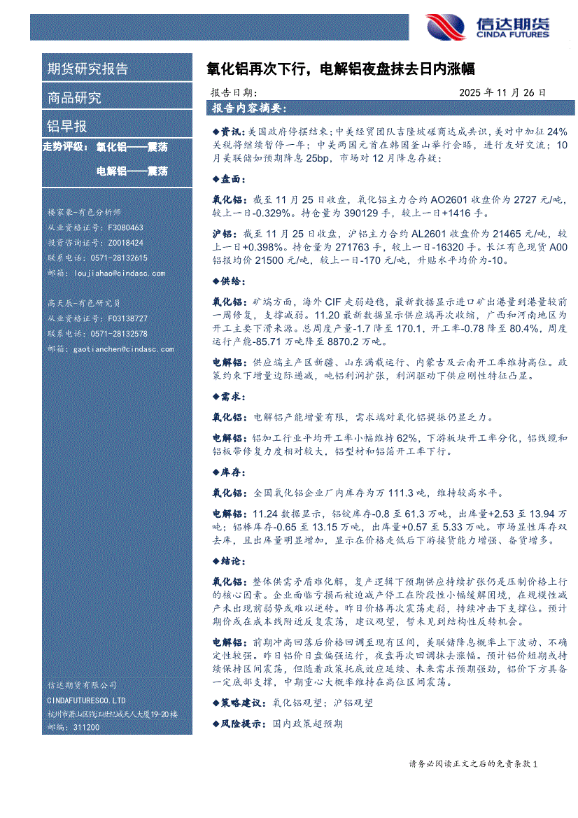 信达期货-铝早报:氧化铝再次下行,电解铝夜盘抹去日内涨幅-251126