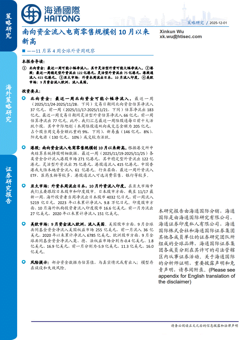 海通国际-11月第4周全球外资周观察:南向资金流入电商零售规模创10月以来新高-251201