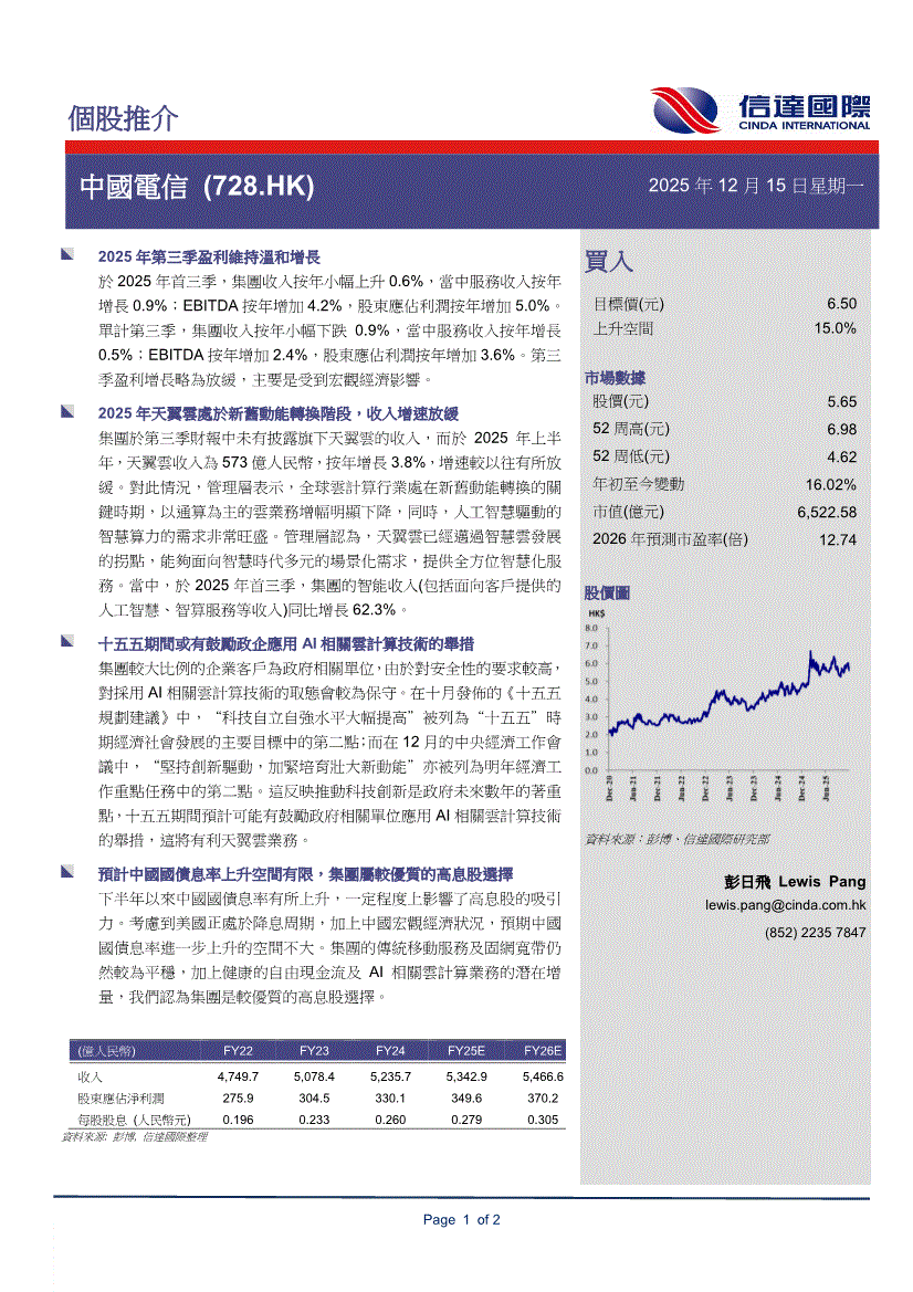 中国电信:信达国际-中国电信-0728.HK-個股推介-251215