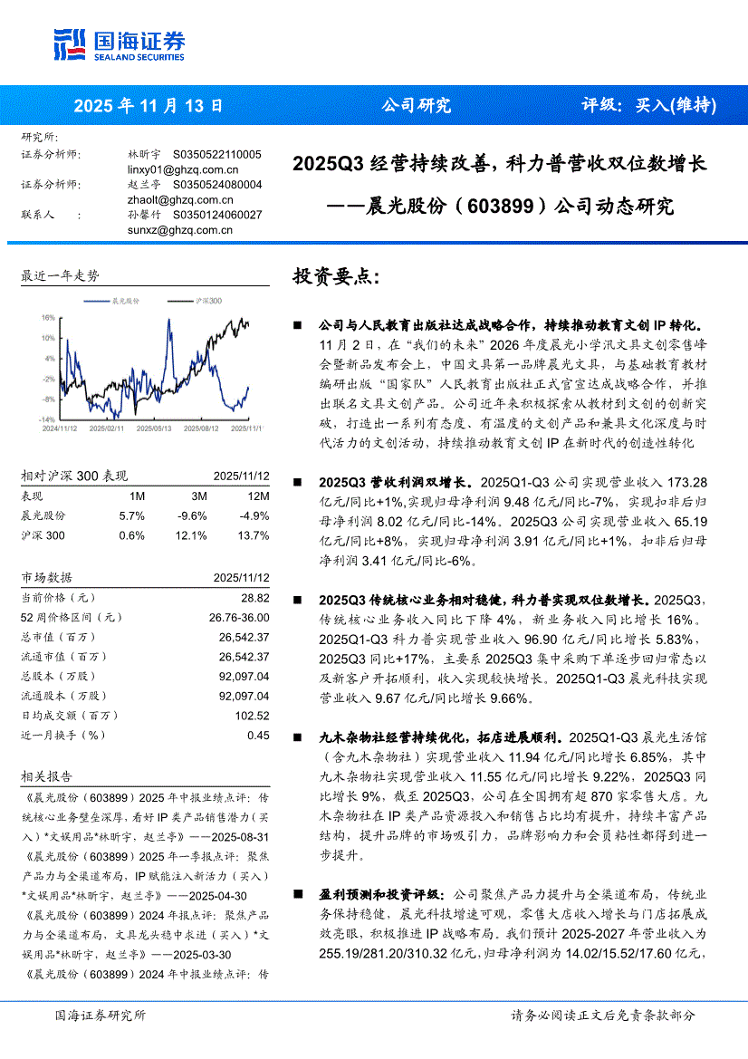 晨光股份:国海证券-晨光股份-603899-公司动态研究:2025Q3经营持续改善,科力普营收双位数增长-251113