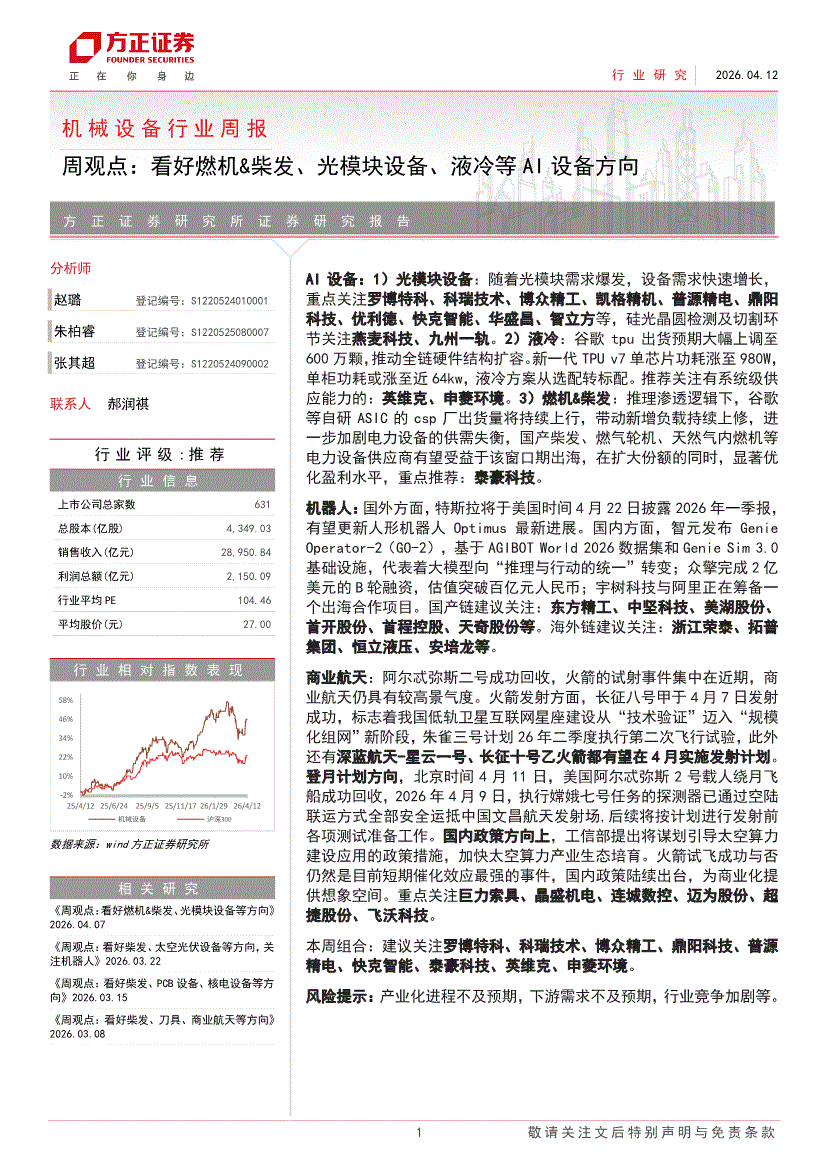 方正证券-机械设备行业周报:周观点,看好光模块设备、燃机柴发方向,关注商业航天、机器人-260419