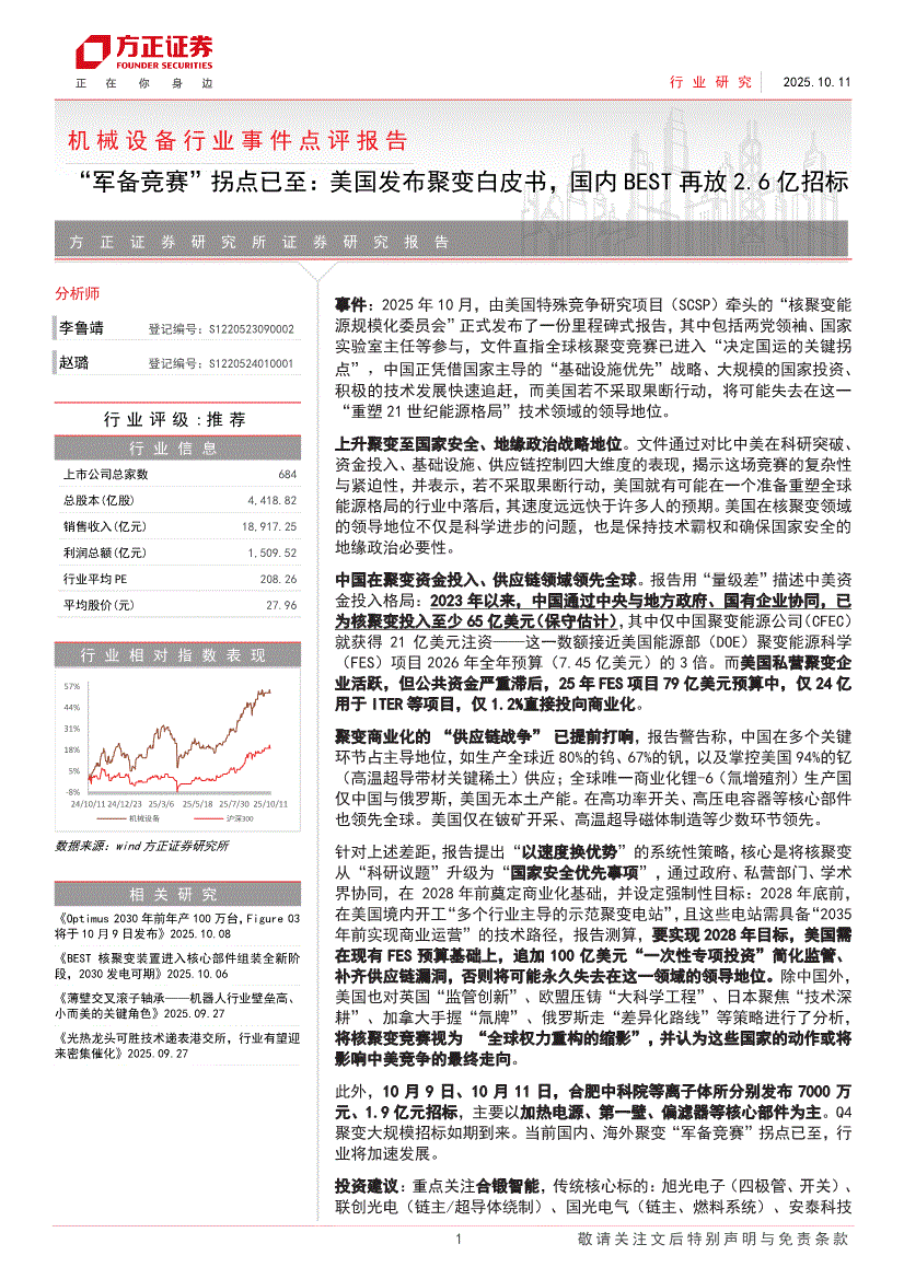 机械设备行业:方正证券-机械设备行业事件点评报告:“军备竞赛”拐点已至,美国发布聚变白皮书,国内BEST再放2.6亿招标-251011
