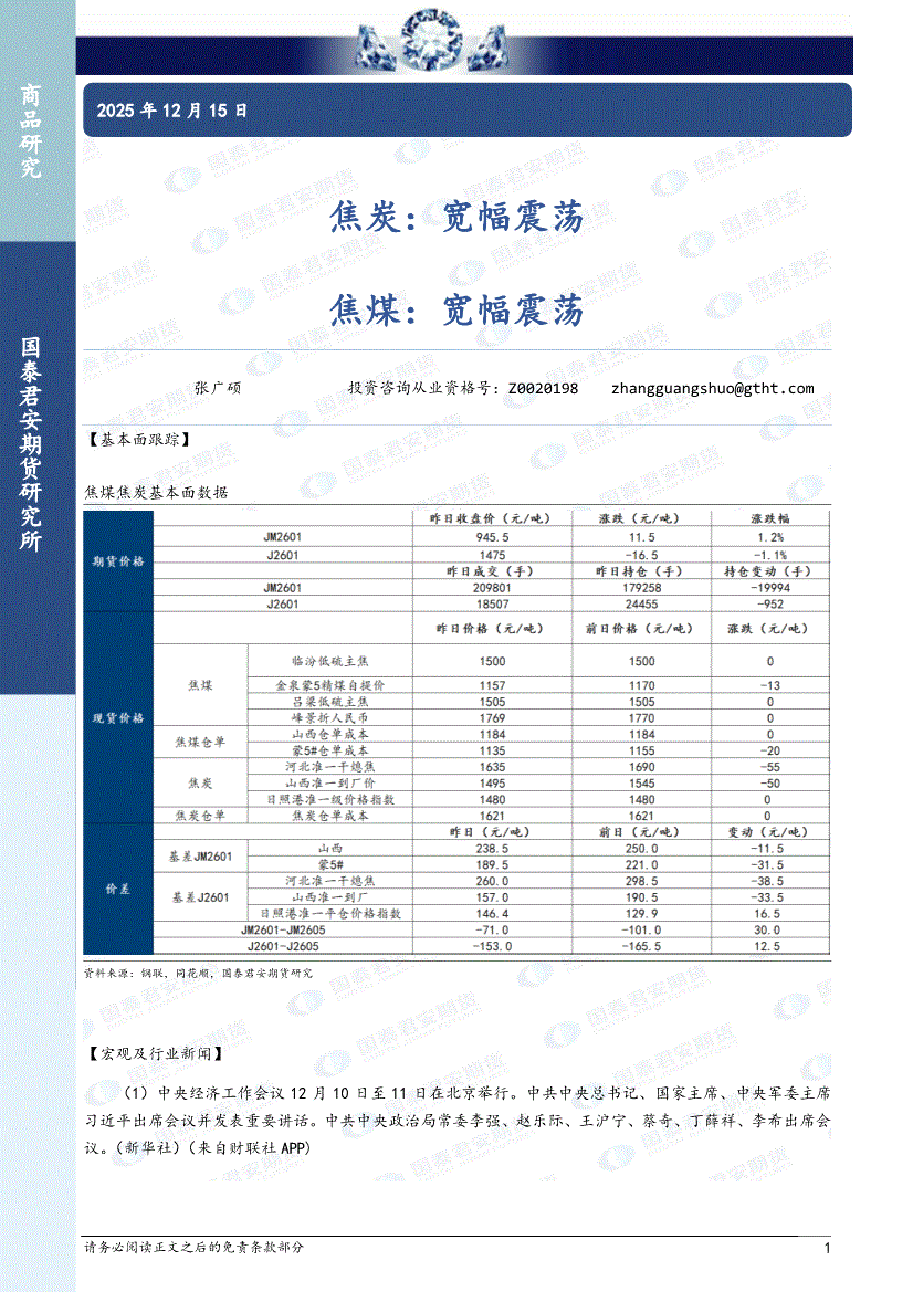 国泰君安期货-焦炭:宽幅震荡,焦煤,宽幅震荡-251215