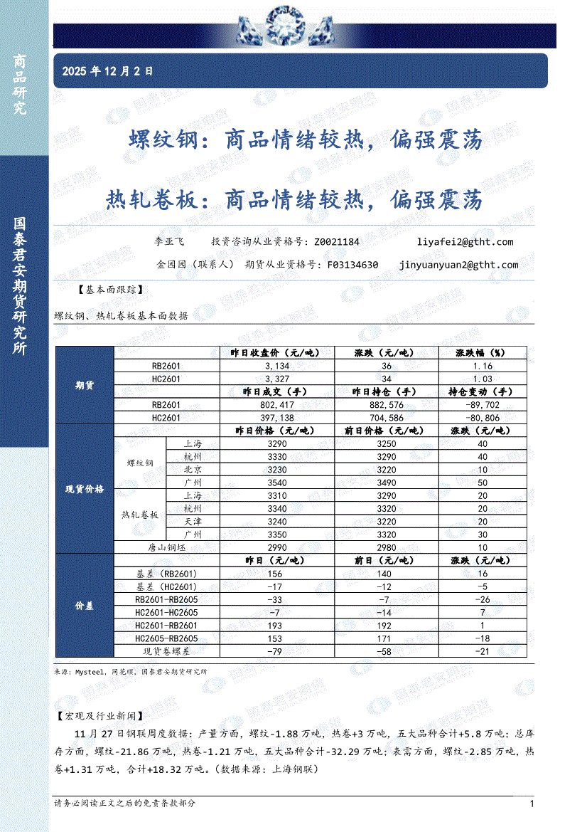 国泰君安期货-螺纹钢:商品情绪较热,偏强震荡,热轧卷板,商品情绪较热,偏强震荡-251202