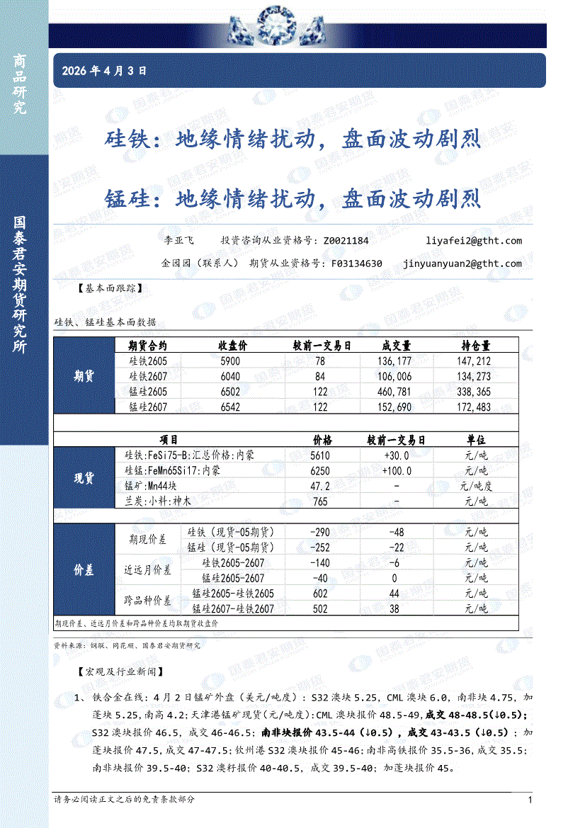 国泰君安期货-硅铁:地缘情绪扰动,盘面波动剧烈,锰硅,地缘情绪扰动,盘面波动剧烈-260403