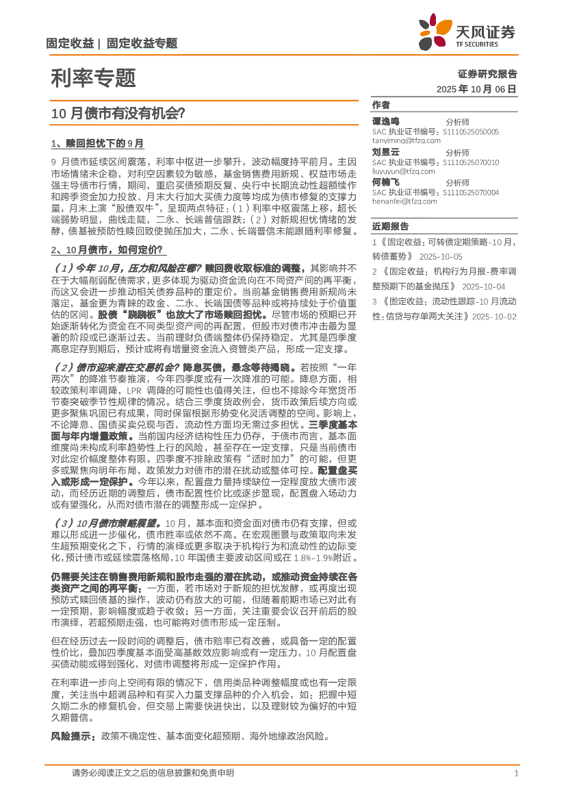 天风证券-利率专题:10月债市有没有机会?-251006