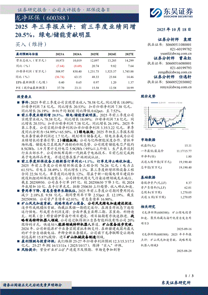 龙净环保:东吴证券-龙净环保-600388-2025年三季报点评:前三季度业绩同增20.5%,绿电/储能贡献明显-251018