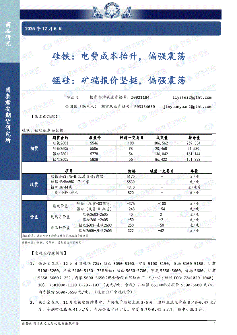 国泰君安期货-硅铁:电费成本抬升,偏强震荡,锰硅,矿端报价坚挺,偏强震荡-251205