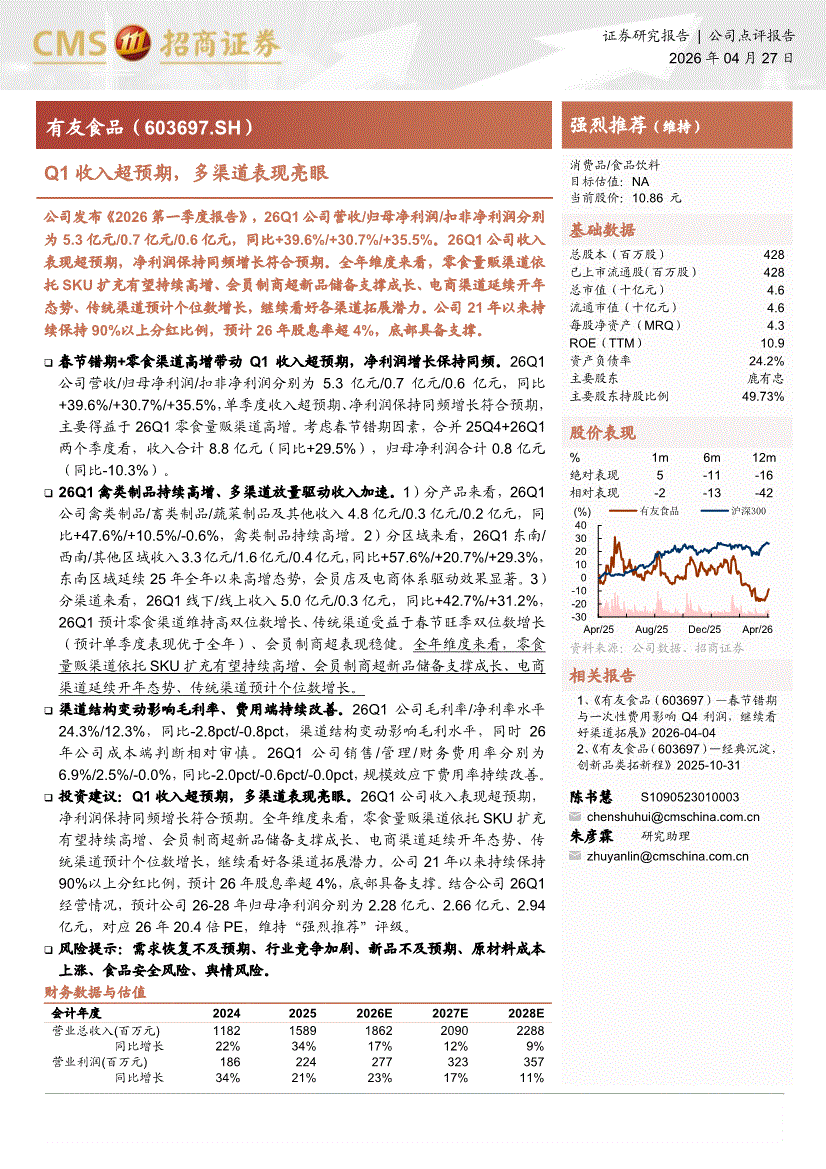 有友食品:招商证券-有友食品-603697-Q1收入超预期,多渠道表现亮眼-260427