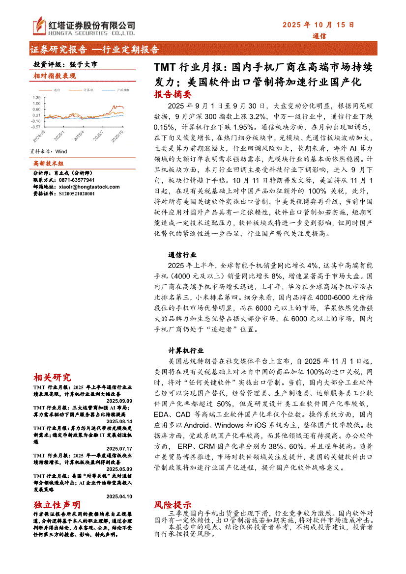 TMT行业:红塔证券-TMT行业月报:国内手机厂商在高端市场持续发力;美国软件出口管制将加速行业国产化-251015