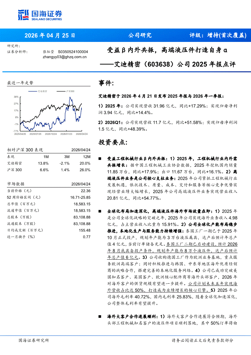 艾迪精密:国海证券-艾迪精密-603638-公司2025年报点评:受益β内外共振,高端液压件打造自身α-260425