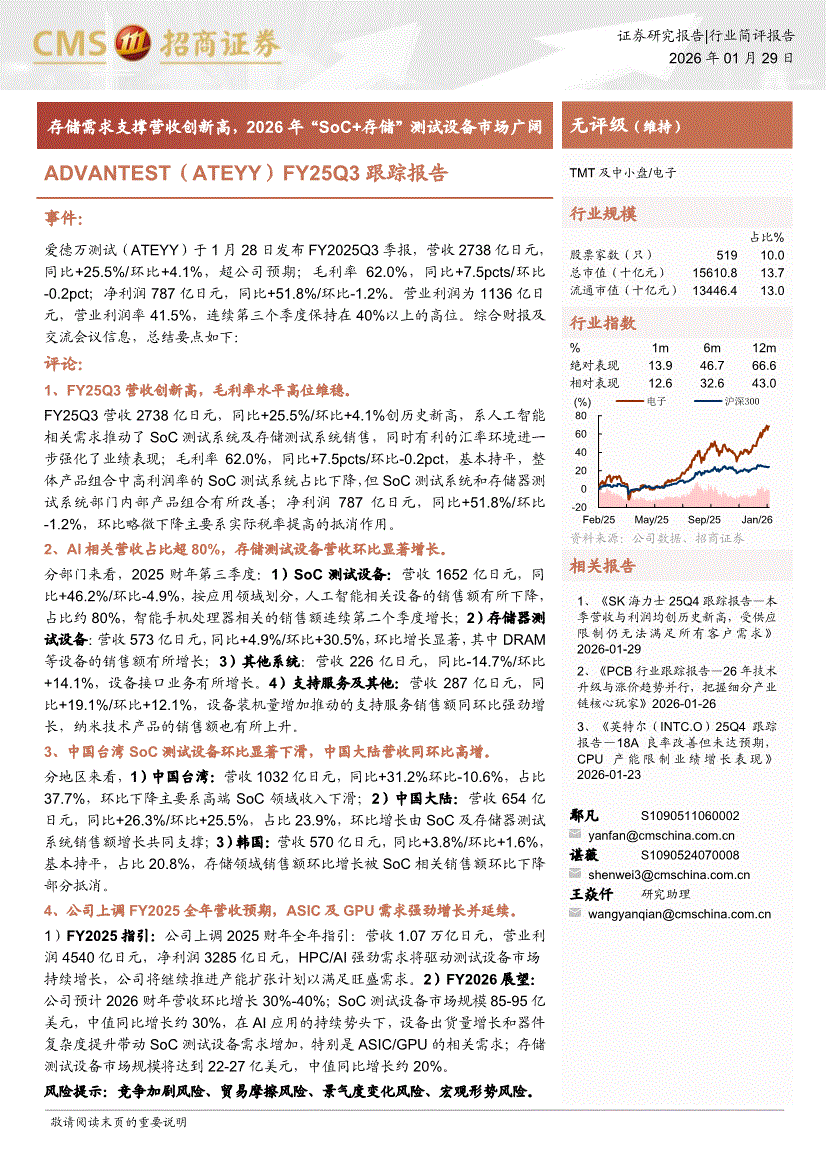 电子行业:招商证券-电子行业ADVANTEST(ATEYY)FY25Q3跟踪报告:存储需求支撑营收创新高,2026年“SoC+存储”测试设备市场广阔-260129