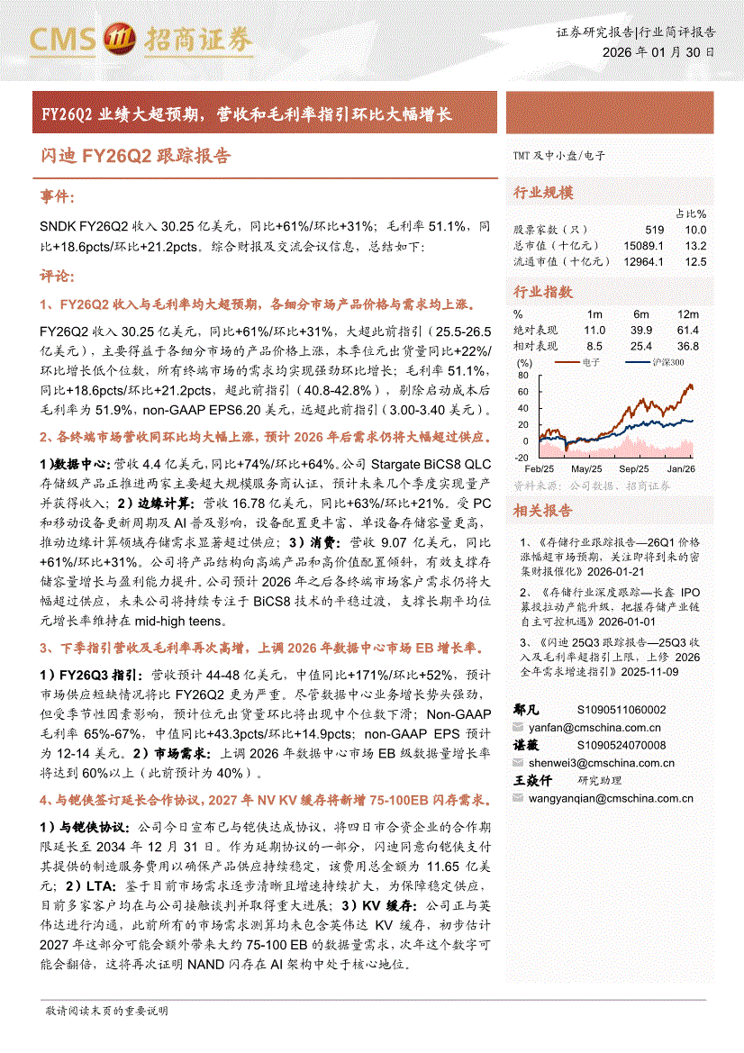 电子行业:招商证券-电子行业:闪迪FY26Q2跟踪报告,FY26Q2业绩大超预期,营收和毛利率指引环比大幅增长-260130