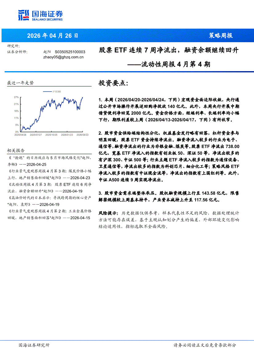 国海证券-流动性周报4月第4期:股票ETF连续7周净流出,融资余额继续回升-260426