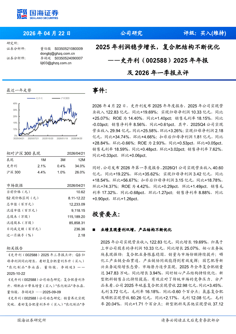史丹利:国海证券-史丹利-002588-2025年年报及2026年一季报点评:2025年利润稳步增长,复合肥结构不断优化-260422