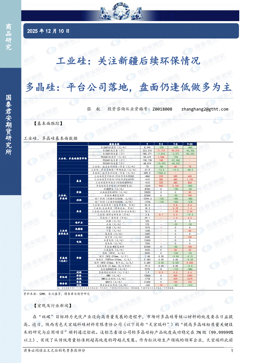 国泰君安期货-工业硅:关注新疆后续环保情况,多晶硅,平台公司落地,盘面仍逢低做多为主-251210