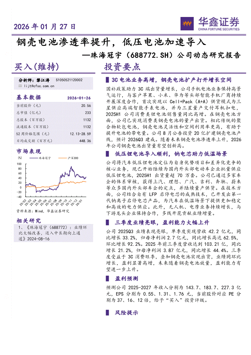 珠海冠宇:华鑫证券-珠海冠宇-688772-公司动态研究报告:钢壳电池渗透率提升,低压电池加速导入-260127