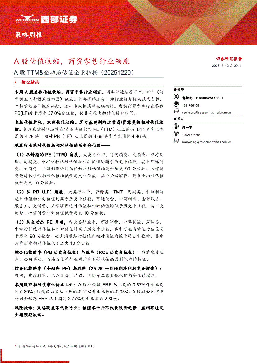 西部证券-A股TTM&全动态估值全景扫描:A股估值收缩,商贸零售行业领涨-251220